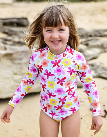 Our long sleeve swimsuit with a scallop frill detail on the side offers excellent UPF 50+ sun protection. Made from recycled fabric, it’s extra-soft and will keep our girls cool while in the sun. It has a long zipper on the back for easy dressing. The zipper is covered to avoid any skin chafing and is fully lined in the body for more coverage.